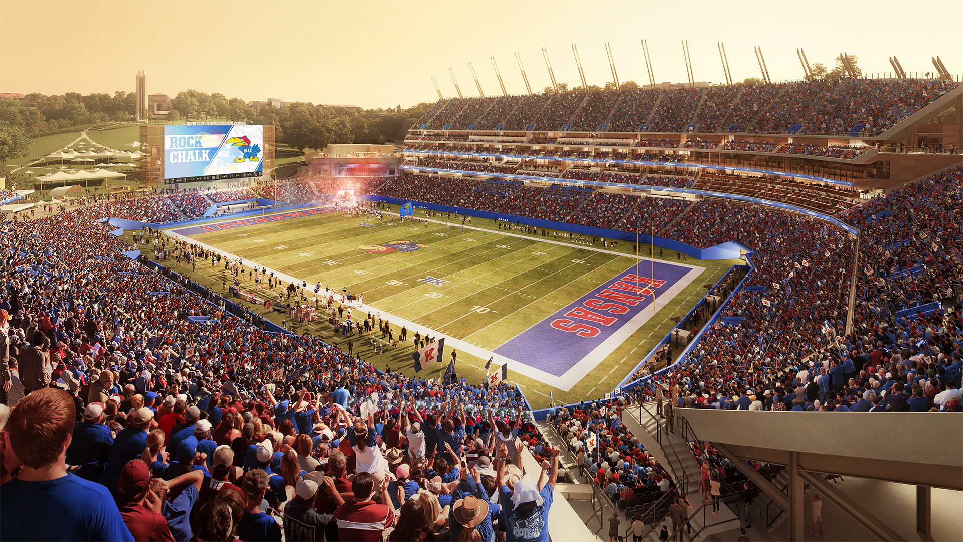 The first phase of the project, which will begin after this season, will see the building of new southwest, west, and north sides for David Booth Kansas Memorial Stadium. The venue will be reduced from its normal capacity of 47,000 for the 2024 season.