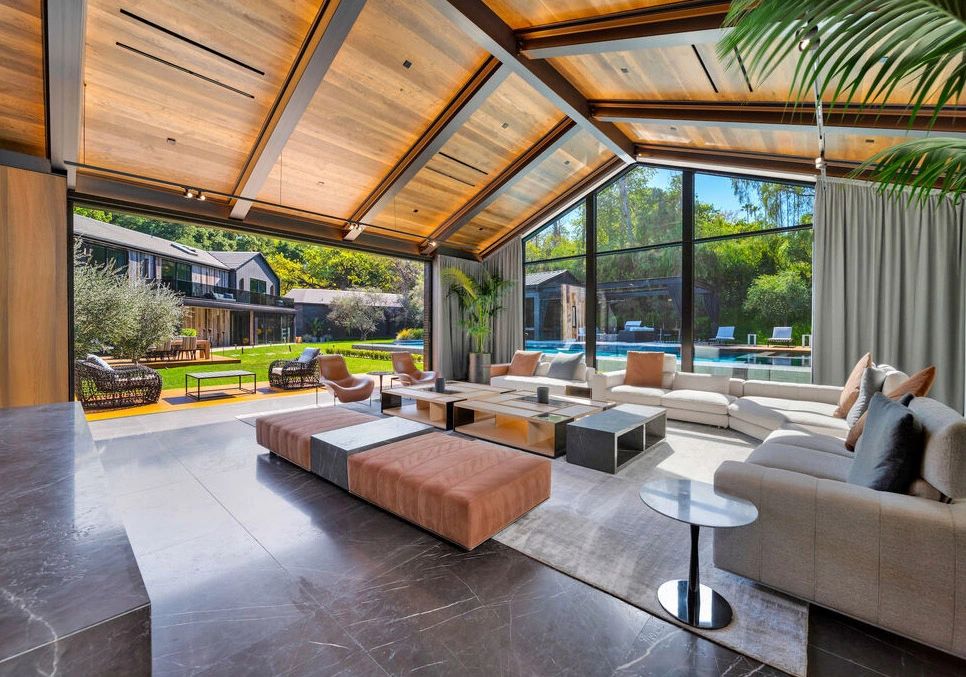 Some amenities in the secluded cul de sac house include two pools, a guesthouse, gym, three-car garage, home theater, indoor zen garden, and more.