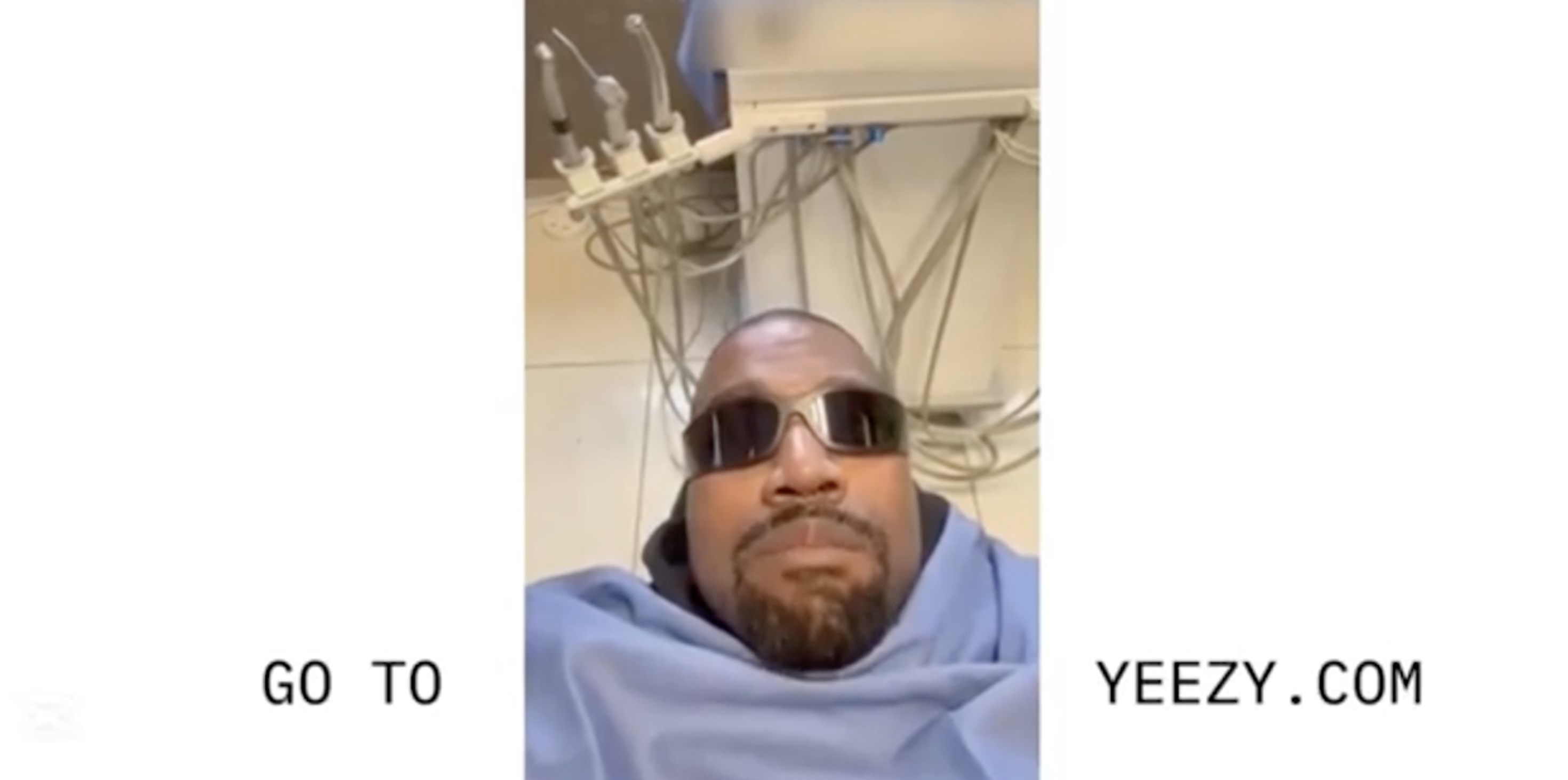 The rapper appeared leaned back in a dentist’s chair, seemingly filming from his cellphone. His vertical video included text reading “Go to Yeezy.com.”