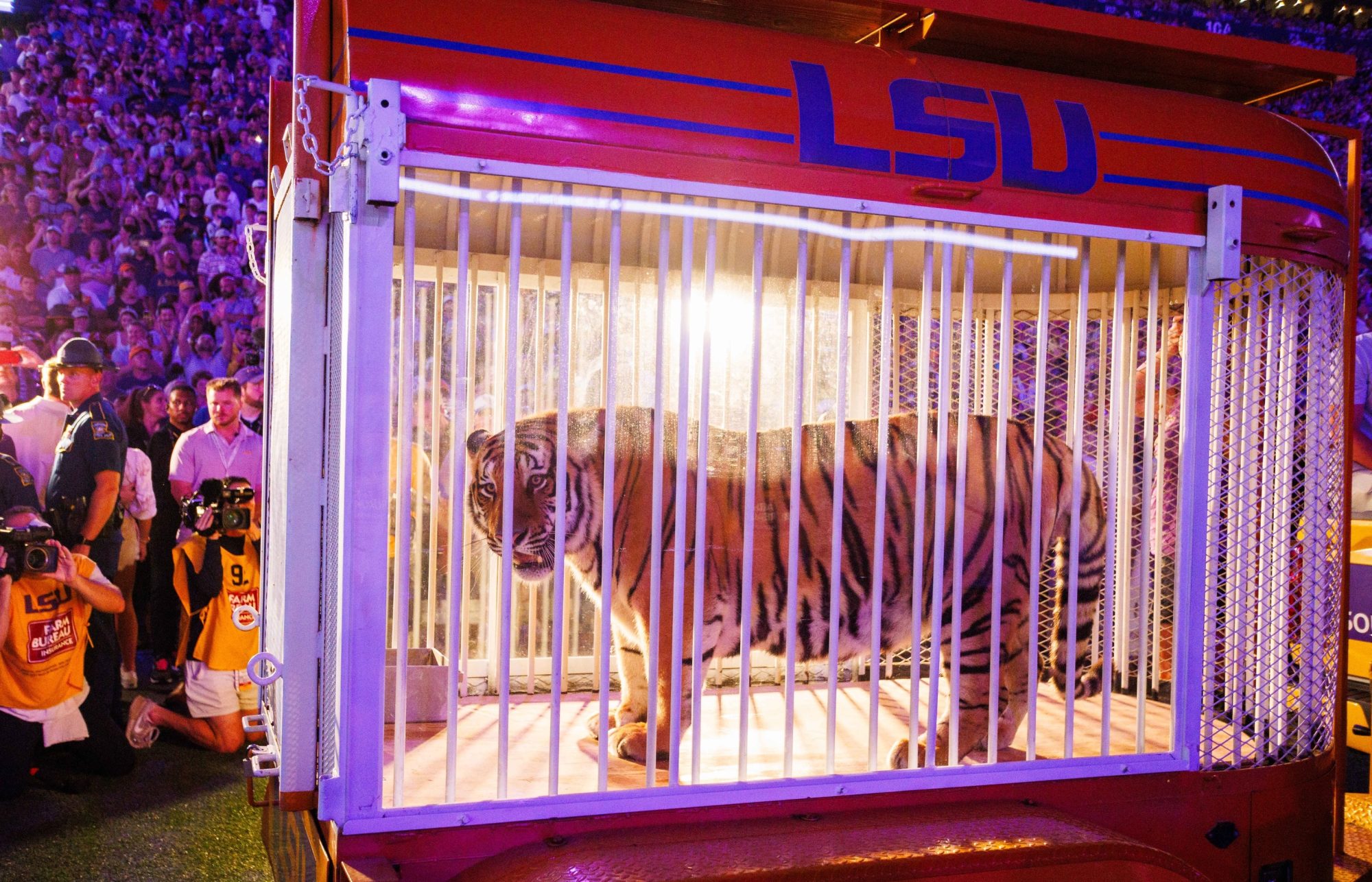 The governor spearheaded the effort, but ran into obstacles when the school’s veterinarians wouldn’t let him use the official mascot, Mike VII. His predecessor, Mike VI, had bad reactions to the lights and sounds at the stadium, and became resistant to getting in the trailer to go to games. The governor instead found a man named Mitchel Kalmanson to drive in Omar Bradley from Florida. Kalmanson’s dealings with big cats over the years have resulted in a slew of USDA violations, including animals being kept in filthy trailers, escaping, and contracting preventable and even fatal diseases.