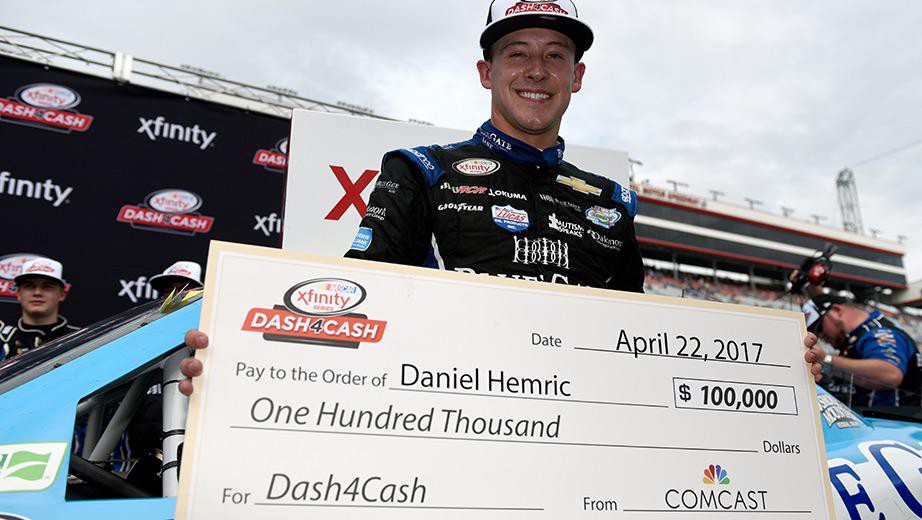 Rookie Daniel Hemric finished the race in fifth place, but won the $100,000 Dash4Cash because he was the highest finishing full-time, points earning Xfinity Series driver.