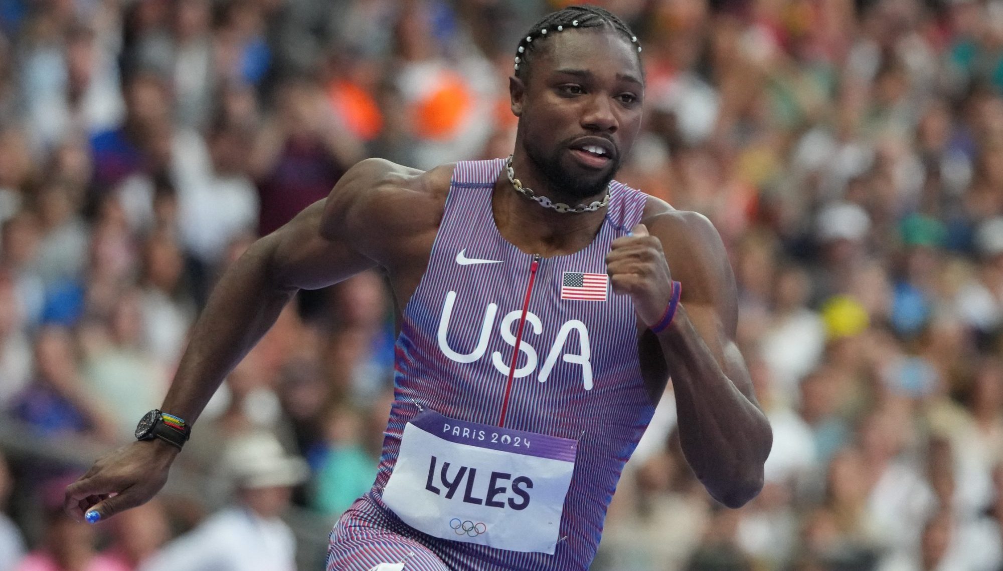 Nike is also the national team sponsor for the U.S., which is why Lyles sports the Swoosh on his tracksuit despite wearing Adidas racers.