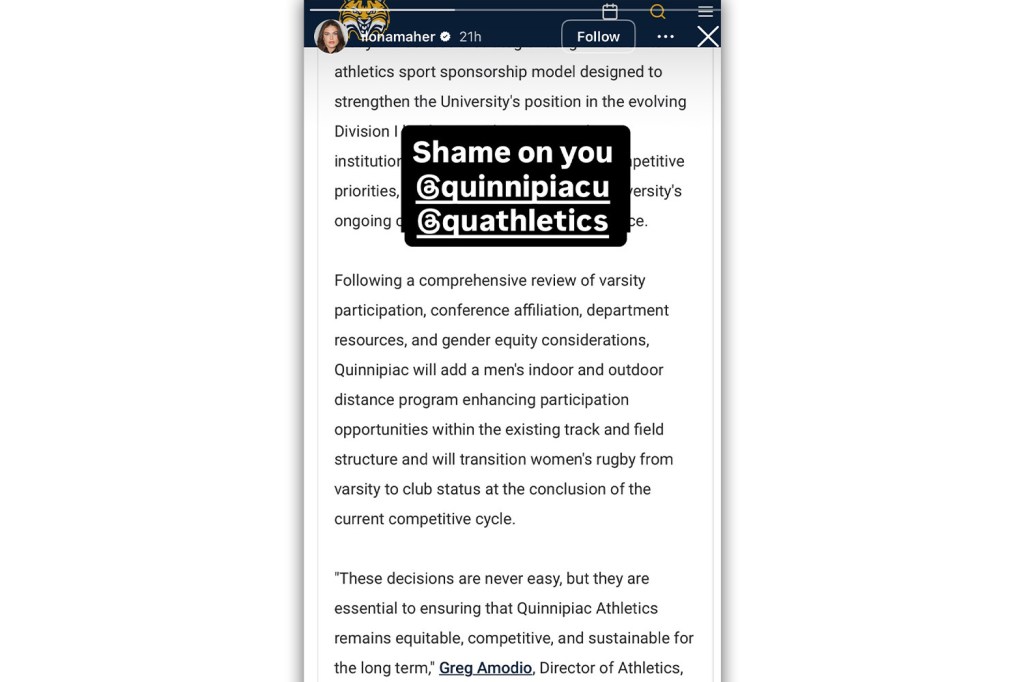 Not only was varsity women’s rugby and its entire coaching staff on the cutting-room floor, but Quinnipiac would also add a men’s indoor and outdoor distance running program. The university said that rugby’s varsity-to-club demotion ahead of the 2026–27 season would enable the school to reallocate resources to programs that they thought had more “long-term competitive” stability.