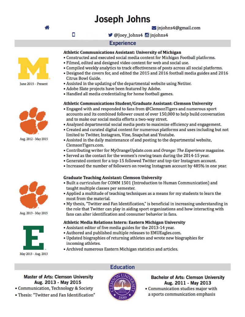Take a look at Joseph John’s (@Joey_Johns4) resume. The colorful logos immediately jump off the page. Sports fans identify with logos and their brand, so right off the bat that are recognizable are the University of Michigan and Clemson University. Two Division I schools with prestigious athletic programs.
