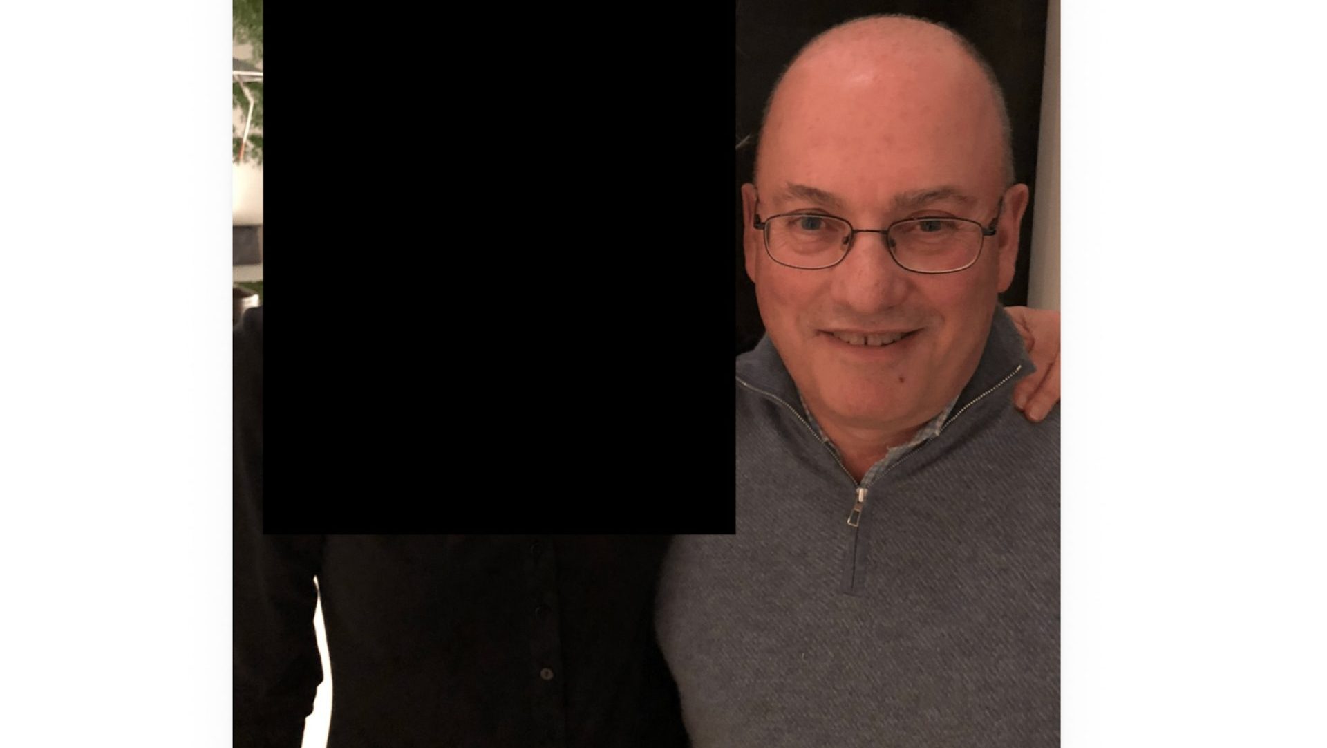 The photo shows a younger Cohen, now 69, wearing a quarter-zip sweater, collared shirt, and his black-framed glasses, smiling with another person. That person is wearing a black button down and has their arm around Cohen, their hand resting on his shoulder.