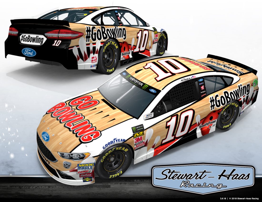 Aric Almirola’s No. 10 Stewart-Haas Racing Ford will feature Go Bowling as a primary sponsor for the race at Watkins Glen International in August. The company has been with Almirola since his days with Richard Petty Motorsports and made the move to SHR along with him. (Image via SHR)